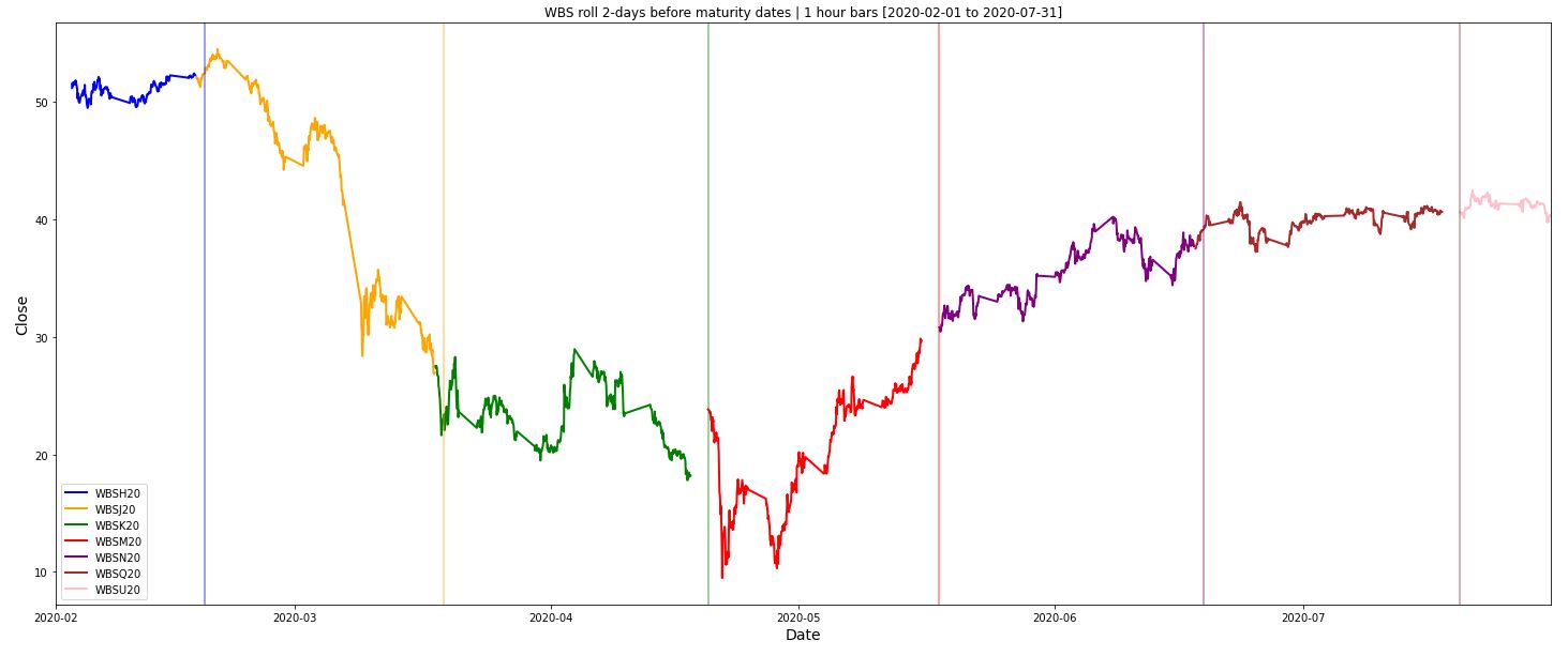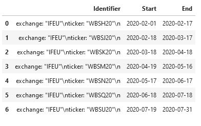 Our rolling method is based in the maturity date. Therefore, we can compute our rolling date by removing N days from the future maturity date. As per consequence, we obtain different time periods with their respective future tickers. To get a continuous price stream, we need to build data requests for each time period and its corresponsing future ticker.