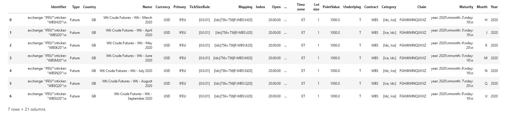 We call get_futures method to return WTI crude oil future maturities matching our input parameters: