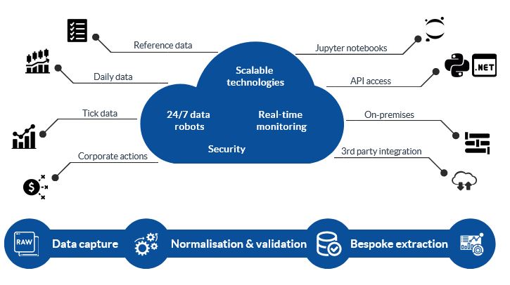 Flexible subscriptions are provided going from API access to on-premises data management solution, through a JupyterLab environment.